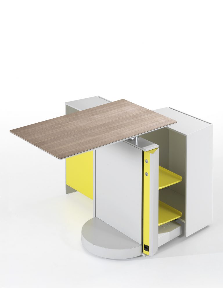 TDU ha una forma semplice e compatta: un piano di lavoro rettangolare sovrapposto a un volume chiuso e composto che, in modalità di utilizzo, si apre articolandosi in due contenitori attrezzati con diversi elementi di complemento e supporto alla postazione. Con il suo design essenziale, TDU si inserisce facilmente in ogni contesto d’arredo e le dimensioni contenute permettono di occupare pochissimo spazio.